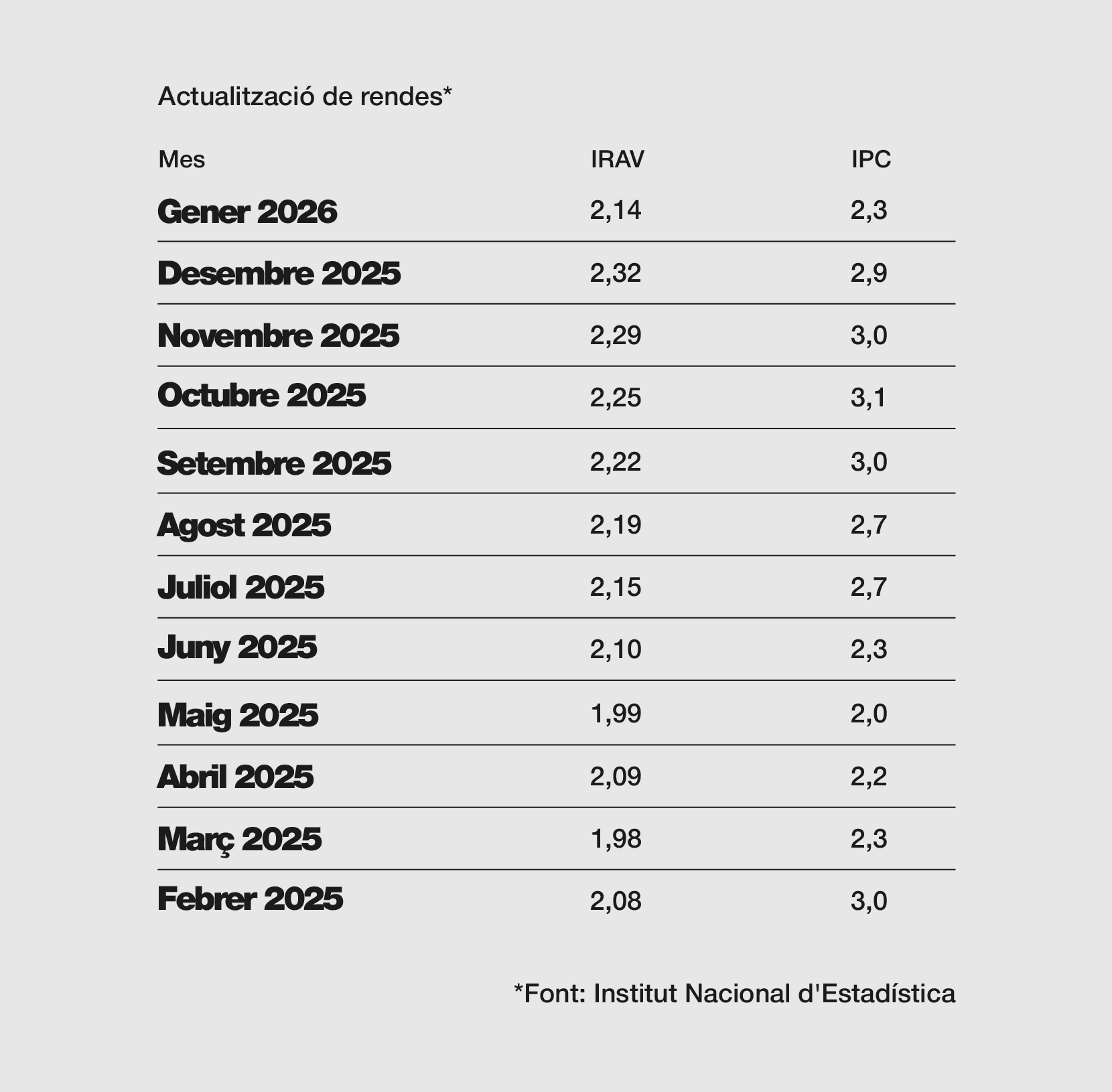 Consulta els valors de Gener de 2026 de l’IPC i de l’IRAV, valors necessaris a l’hora d’actualitzar la renda dels contractes de lloguer